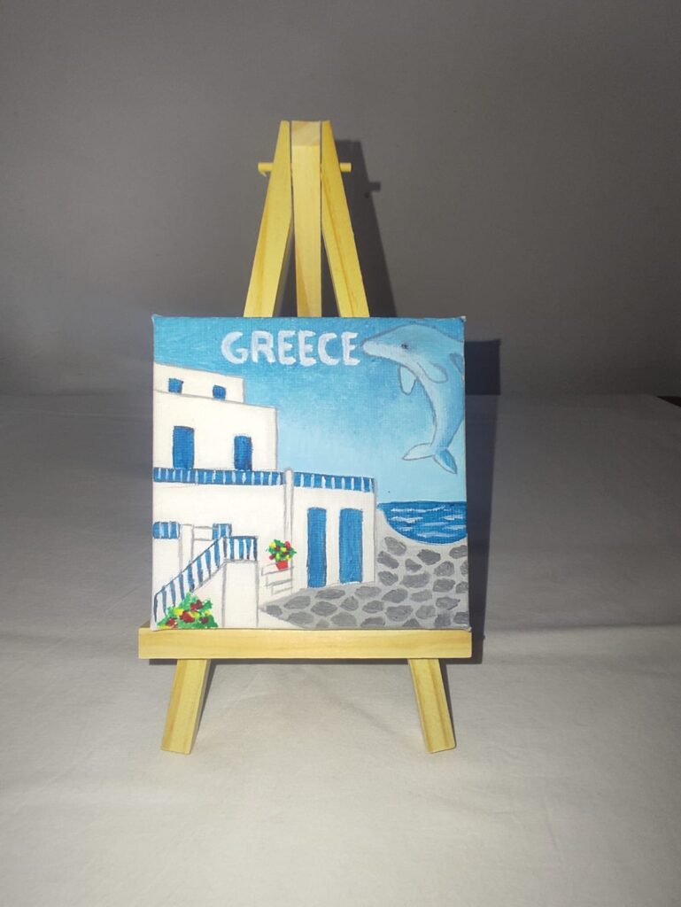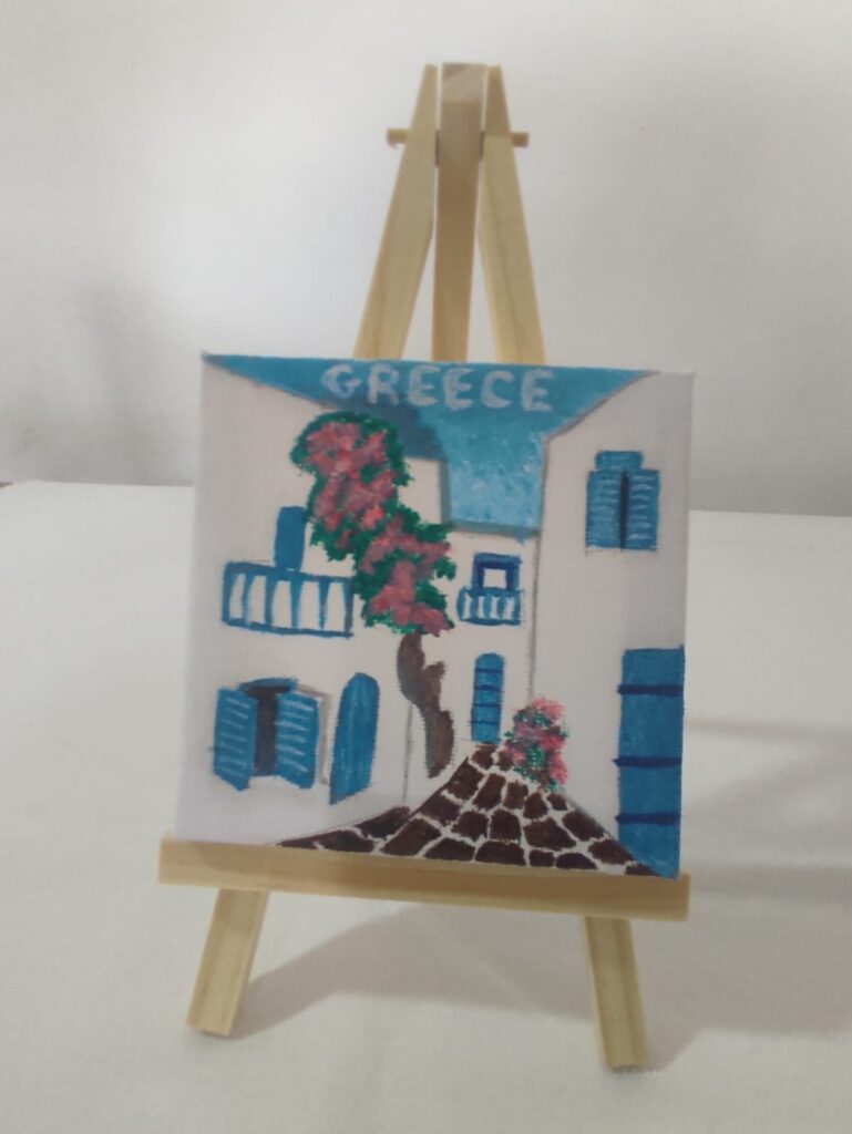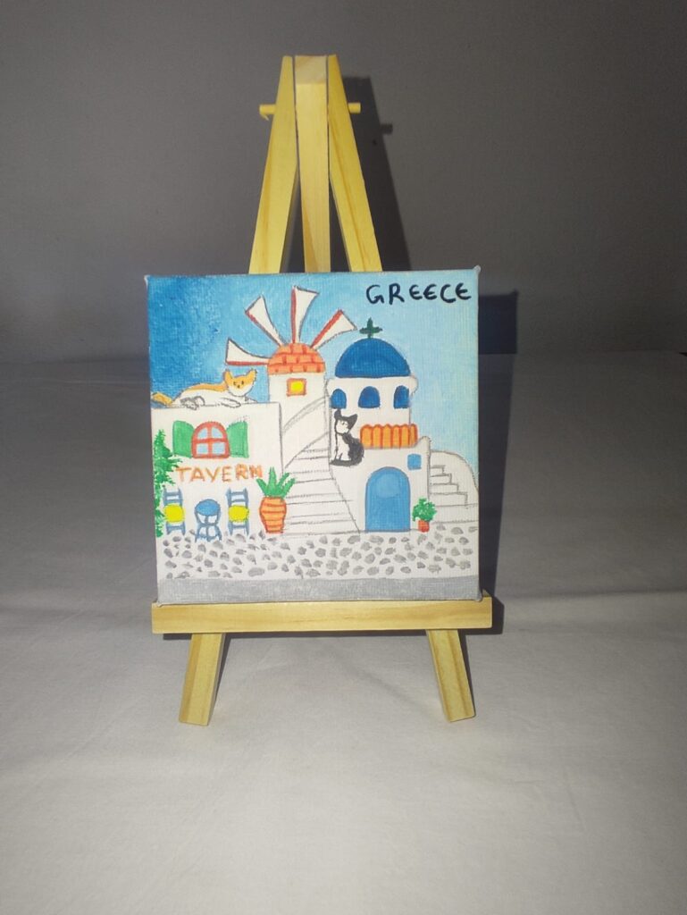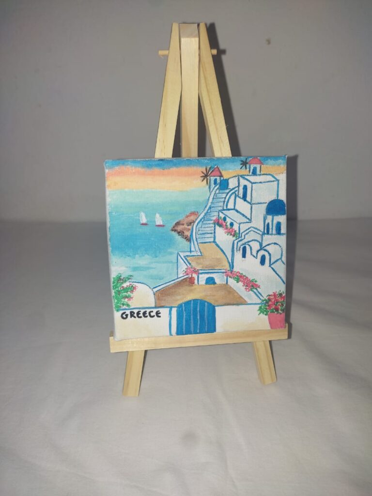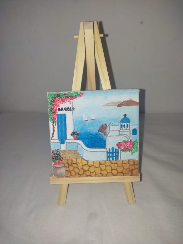 All souvenirs are painted on canvas and can decorate a wall or with the extra wooden base any part of the house. The dimensions are 10cm by 10cm.