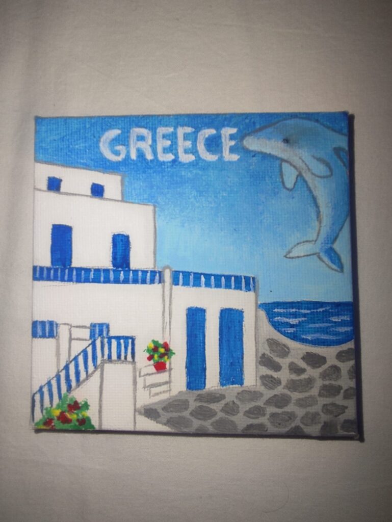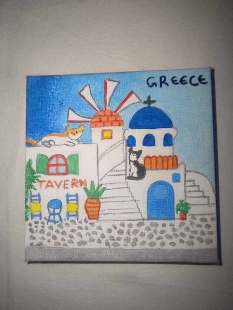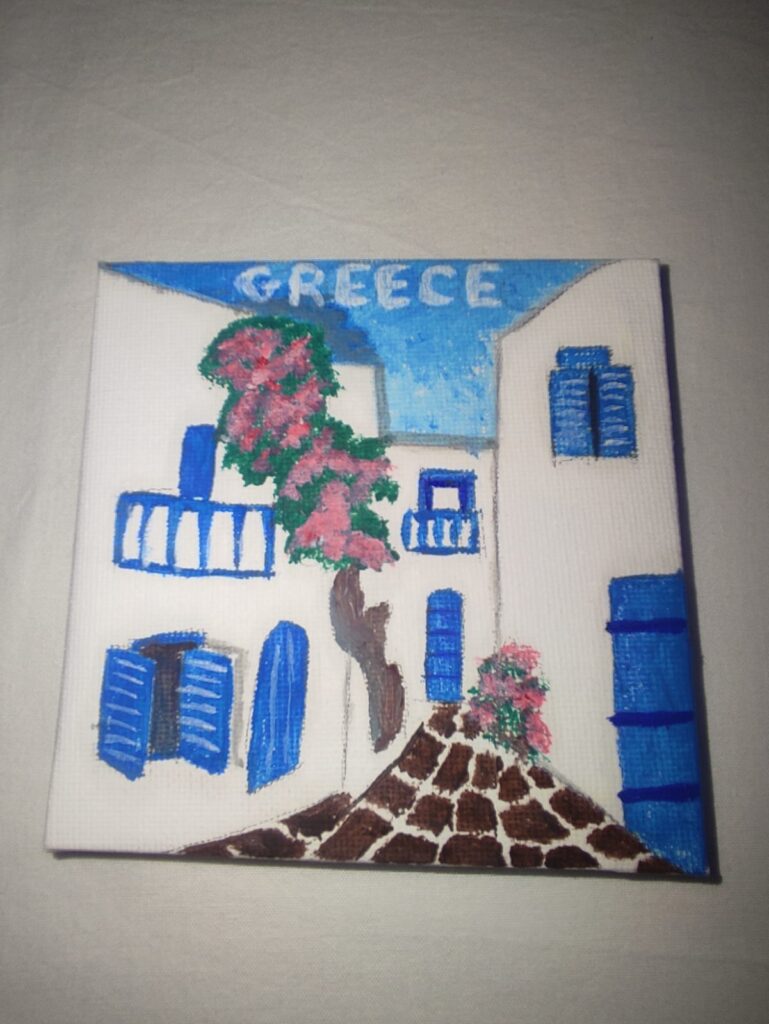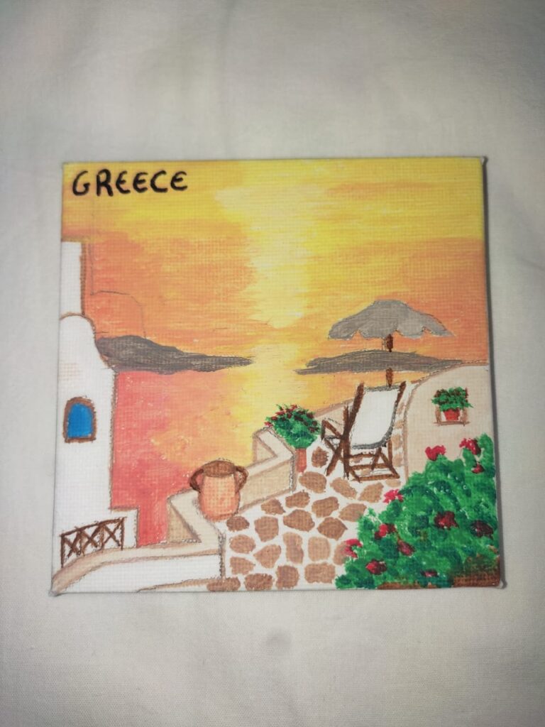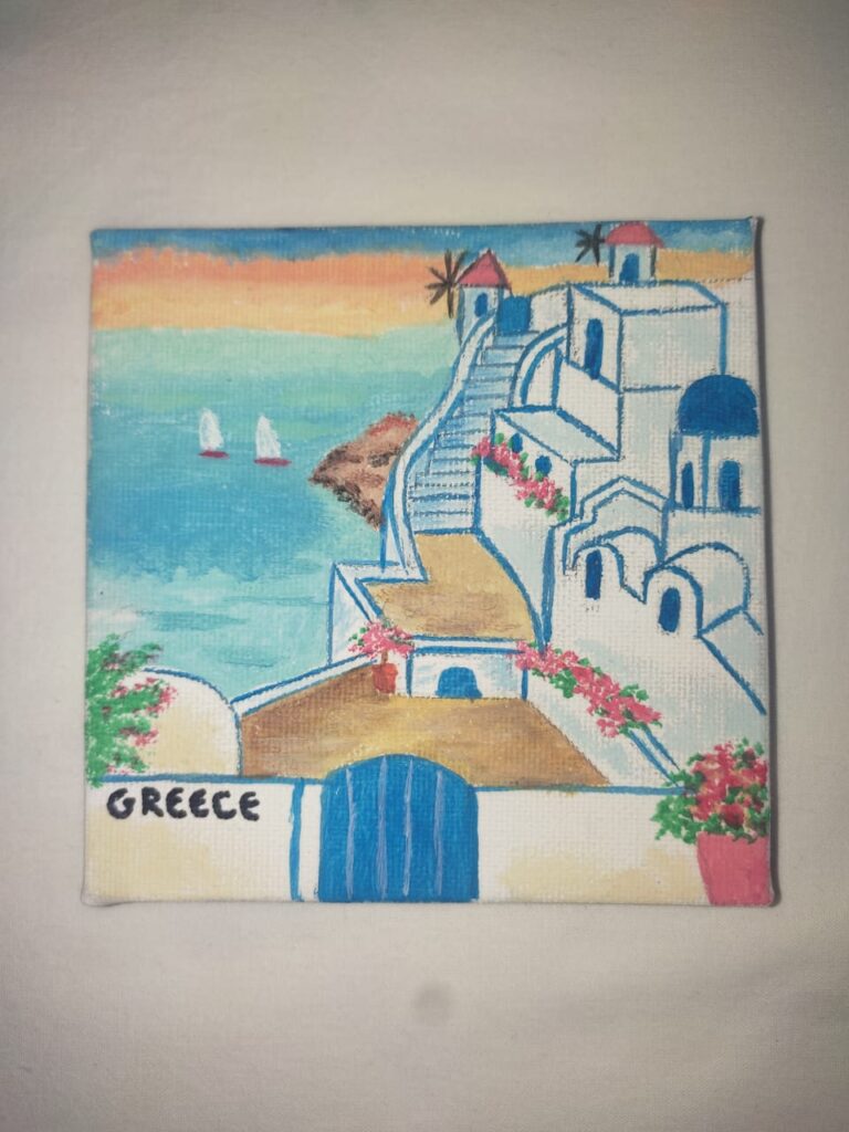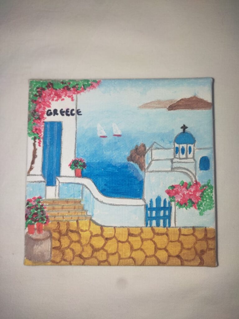 All souvenirs are painted on canvas and can decorate a wall or with the extra wooden base any part of the house. The dimensions are 10cm by 10cm.